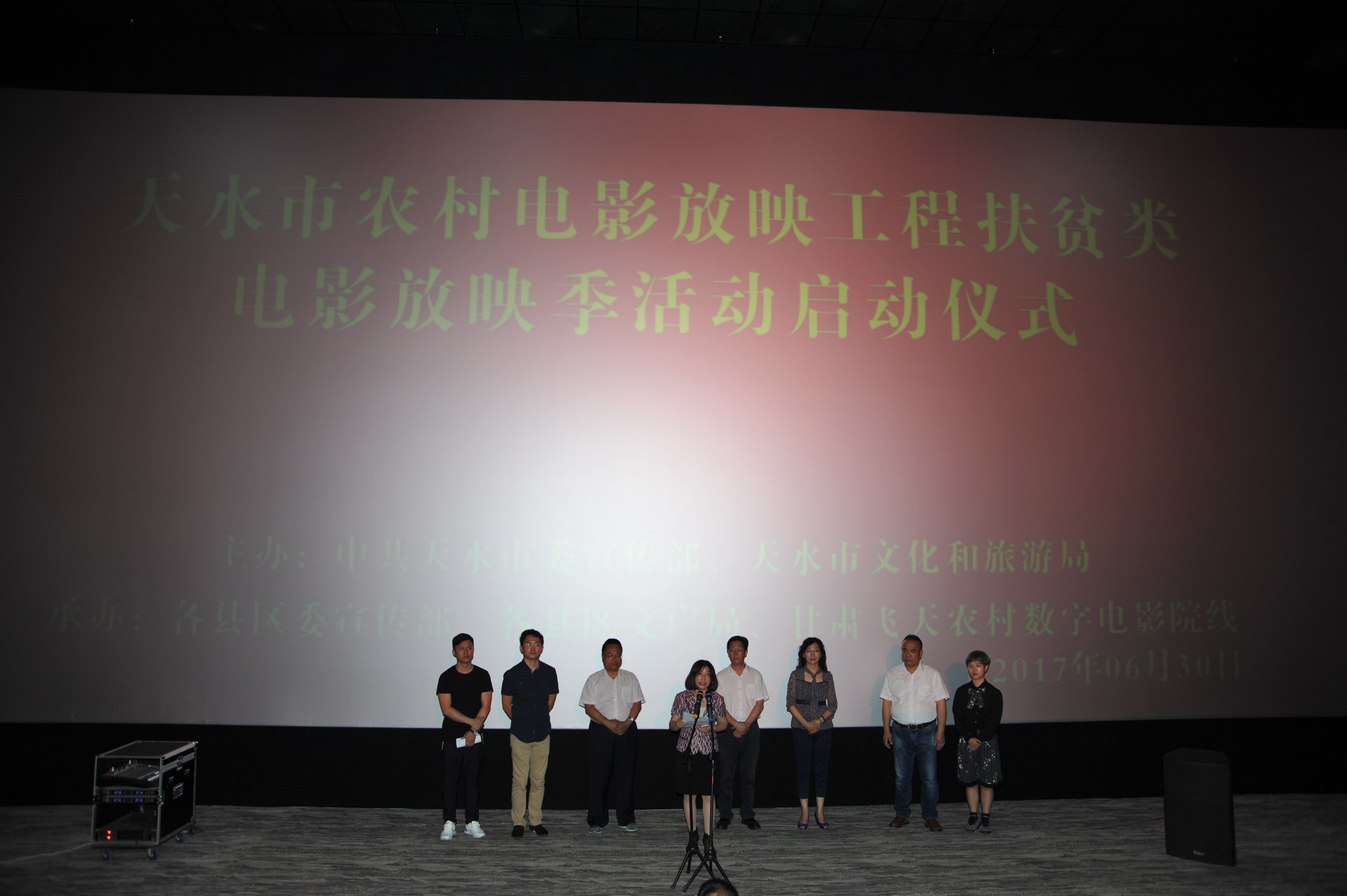 2017年6月30日,由中共天水市委宣傳部、天水市文化和旅游局,聯(lián)合主辦的"農(nóng)村電影放映工程扶貧電影放映季"活動的啟動儀式在天水市秦州區(qū)佳水岸小鎮(zhèn)時代影城隆重舉行。天水市委宣傳部、天水市文化和旅旅局、天水市扶貧辦、甘肅飛天院線公司代表、秦州區(qū)委宣傳部、區(qū)文廣局領(lǐng)導(dǎo)、電影導(dǎo)演以及農(nóng)民、學(xué)生、干部群眾、放映員、各媒體記者等170人參加了啟動儀式。