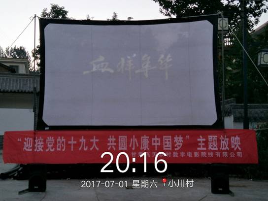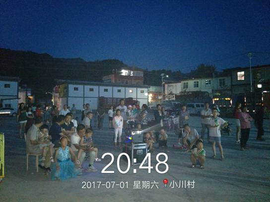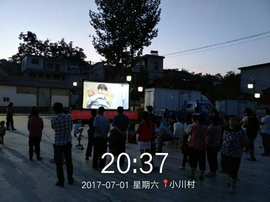 2017年7月1日,隴南市成縣小川鎮(zhèn)在小川鎮(zhèn)鎮(zhèn)民俗文化廣場舉行以踐行"兩學(xué)一做"學(xué)習(xí)教育、爭做先鋒表率為主題黨員表彰大會暨慶祝建黨96周年文藝匯演活動,活動中對全鎮(zhèn)優(yōu)秀共產(chǎn)黨員進(jìn)行了表彰。在文藝匯演活動后小川鎮(zhèn)政府邀請甘肅飛天院線第六工作站放映員陳海波進(jìn)行愛國主義電影專場放映。放映員當(dāng)日放映了《血樣年華》《血色烽煙之絕地鋤奸》等優(yōu)秀影片, 放映影片得到了當(dāng)?shù)厝旱囊恢潞迷u。