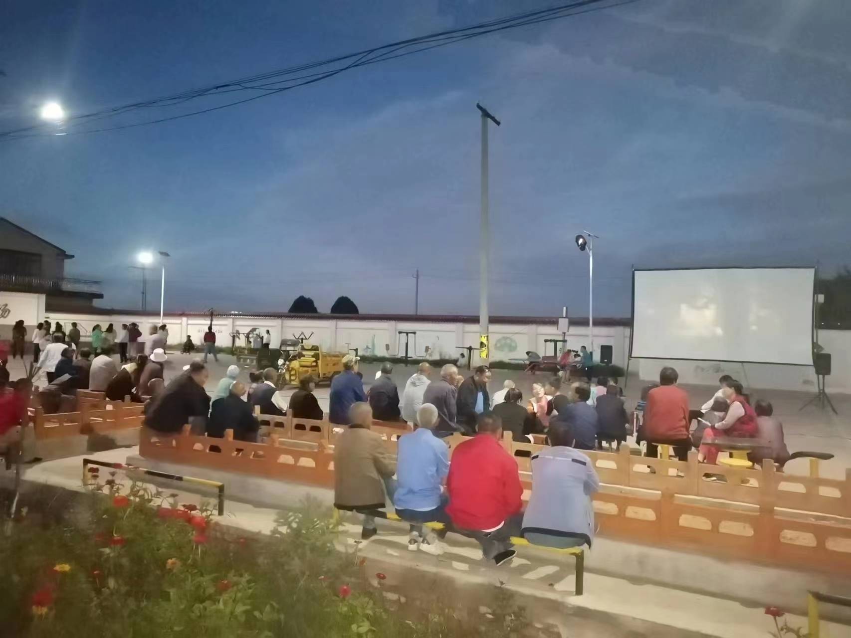 清爽秋日,觀眾的觀影熱情依然不減, 調(diào)音響、掛銀幕、擺凳子……放映員們動(dòng)作麻利,很快電影便開演了,村民們圍著銀幕,看得津津有味。
